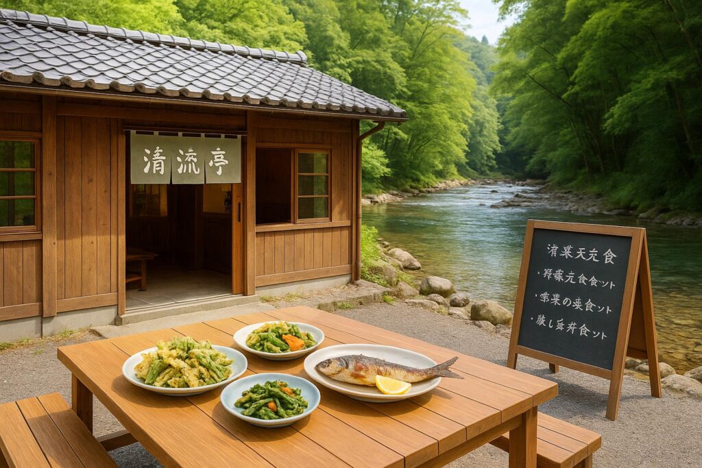 店内は木造の落ち着いた雰囲気で、窓越しに流れる清流と山々の緑が心を和ませます。地元住民はもちろん、観光客にも愛される隠れた名店です。